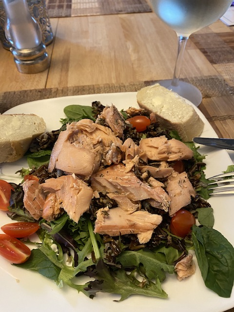 Körsbärstomaterna skar jag upp och sedan gjorde vi tre sallader direkt på tallrikarna: först en handfull spenat och andra gröna blad, sedan uppskurna tomater, det svalnade riset, dressing och sist, men inte minst den färdigrökta laxen. Jag råkade ha baguette i frysen som vi hastigt och lustigt värmde i ungen på några minuter och serverade till salladen.