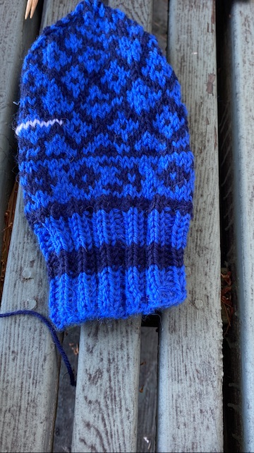 Mönstret är jag nöjd med och ikväll blev den andra vanten klar. Nu återstår dock tummarna igen och nu får jag nog helt enkelt sätta mig ner och koncentrera mig en stund för att få dem in snyggt och fint… Förhoppningsvis lyckas de….
