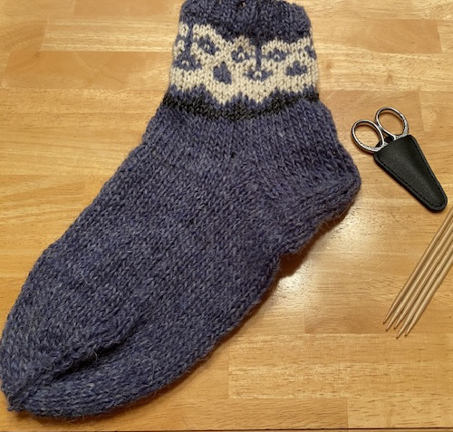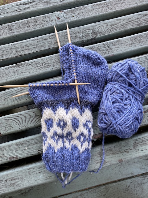 De nygifta åkte iväg på lite shopping medan jag slog mig ned med ett nytt, litet stickprojekt. Jag fick nämligen Lettlopi garn som försenad födelsedagspresent av Dottern från Island och med garnet kom också ett mönster på en mössa. Jag råkade faktiskt ha med mig två nystan Lettlopi hemifrån och beslöt mig för att testa mönsterbeskrivningen på ett par yllesockor åt henne istället eftersom jag ändå inte har rundstickar medhavda denna gång. Sagt och gjort.