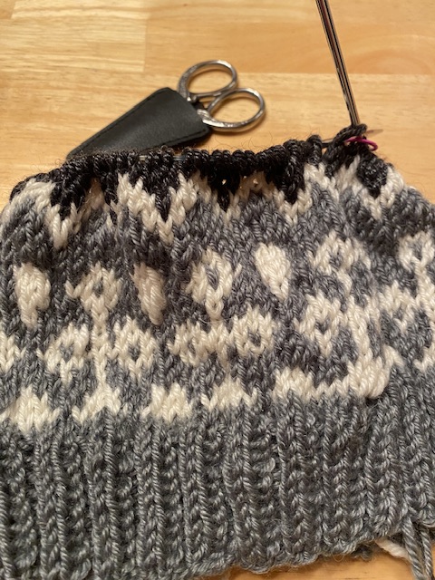 Jag blev alldeles precis klar med de 19 mönsterraderna och bad Maken hjälpa mig välja den mörka, gråa färgen som ses högst upp. Imorgon medan vi kör hem hoppas jag blir klar med denna…