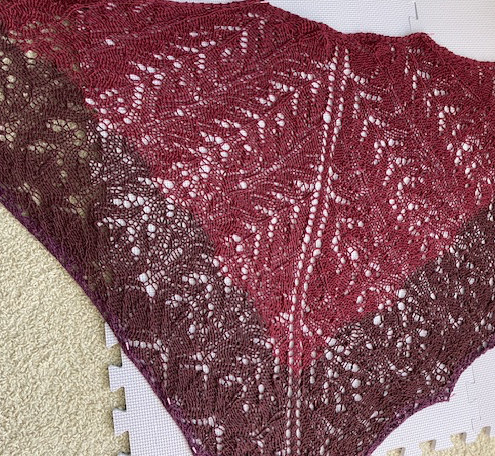 Sjalen som blev klar på torsdagen ser ut så här idag efter att den är sgs torr. Imorgon skall jag ta lös från nålarna som håller den på plats. Det brukar bli spännande.