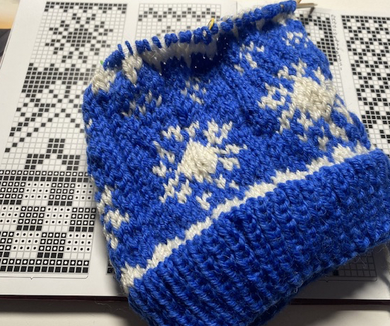 VI blev bara två stycken idag som träffades och handarbetade med det var trevligt ändå! Istället för att söka oss ner till det lilla mötesrummet i källaren där vi vanligen håller till, valde vi att sitta utomhus i det vackra vädret. Jag satte upp 85 maskor och började på…. Jag använde förslag på mönster ur en fantastisk, mycket flitigt använd bok som jag inhandlande förra vintern och blev genast nöjd med mina val av mönster. Vi stickade mellan kl. 10-12 och sedan kallade plikterna igen och var och en åkte hem till sitt. Nu på kvällen har jag fortsatt med mössan. Mönstret är klart och imorgon hoppas jag bli helt klar med den…
