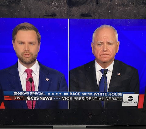 … ses här till höger i bild. Tim Walz, Minnesotas väldigt duktiga och populära guvernör, debatterade ikväll senatorn från Ohio, JD Vance. Tim Walz valdes i somras av presidentkandidaten Kamala Harris att bli hennes vice president om hon vinner valet. JD Vance är Trumpens kandidat för samma post.
