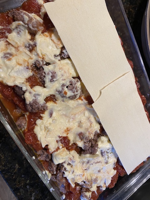 På denna bild syns alla lagren: det stekta, malda köttet, lasagne plattorna, den vita röran och den hemmagjorda pastasåsen.