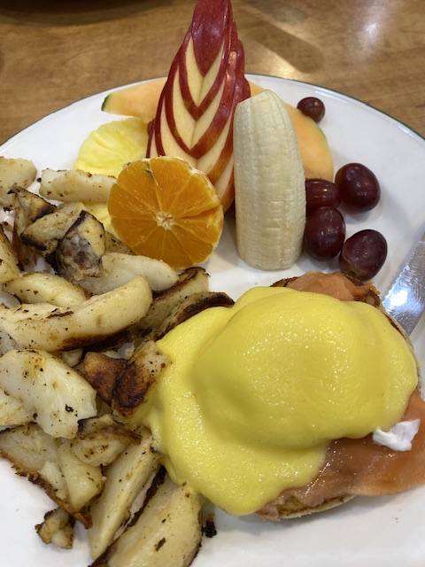 Denna första heldag i Kanada blev en riktigt fint dag. Vi började naturligtvis med stickning direkt från morgonen och till lunchen blev det restaurangbesök på Cora. En kedja från Quebec som serverar frukost och lunch. Deras signatur om man så säger är färsk frukt som serveras med maten. Både Väninnan och jag valde Eggs Benedict med rökt lax och ägg.