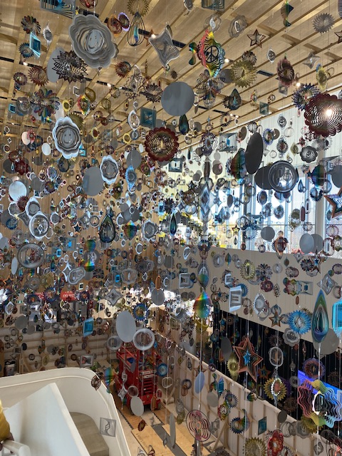 Denna fina utställning med dessa mobiler över trappan välkomnade oss upp till den tredje våningen där utställningen med väggbonader hölls.( Jag undrade i mitt stilla sinne hur många mobiler som verkligen hängde där och hur länge det tog att hänga dem…?!)