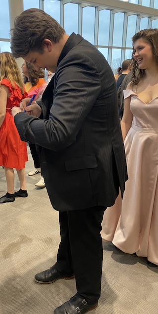 Naturligtvis får inga bilder tas under musikalens uppförande, så det fick bli bilder efteråt istället. Här ses Lillasyster till höger och Pojkvännen till vänster. Pojkvännen spelar en av huvudrollerna. Prästen Shaw och han hamnade att skriva autografer till småflickorna ( som jag tog bort ur bilden) som kom upp till honom efteråt!