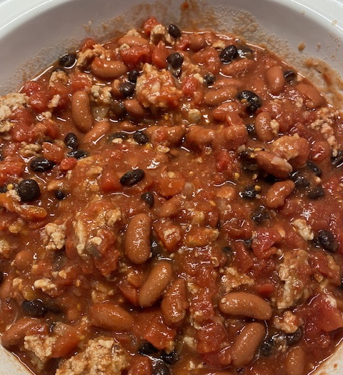 Chilin gjord på konserverade tomater, tomatpuré, stekt malen kalkon med lök, tre olika slags bönor och kryddor fick koka i min Crock Pot hela dagen och den blev ringt god. Ju längre chili kokar, desto bättre smakar den.