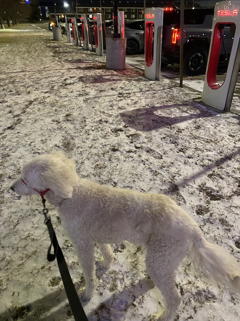 När vi stannade för att ladda bilen rastade jag henne och hon var lugn och sansad. Njöt av den kalla vinden och minusgraderna, vilket hon alltid har gjort. Vi gick runt en stund i det snötäckta gräset och det fanns en hel del att snusa och nosa på. Efter en stund blev det dock kallt om tassarna och hon hoppade glatt in i baksätet på sin filt igen.
