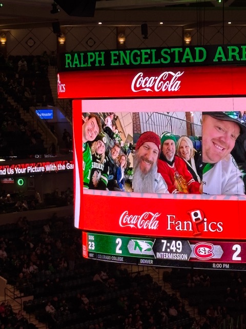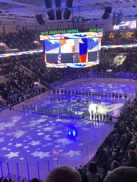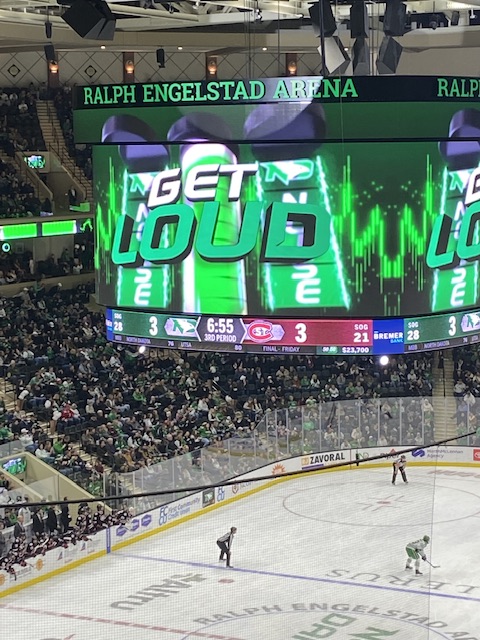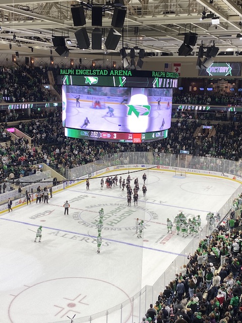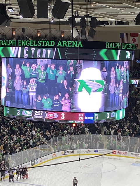 Vilken hockey match det blev mellan Sonens universitet ( UND) och bortalaget som kom från Minnesota. Till och med jag, som inte är särskilt intresserad av hockey satt på ändan av läktarsätet när matchen gick in i 5 minuters övertid med ställningen 3-3.