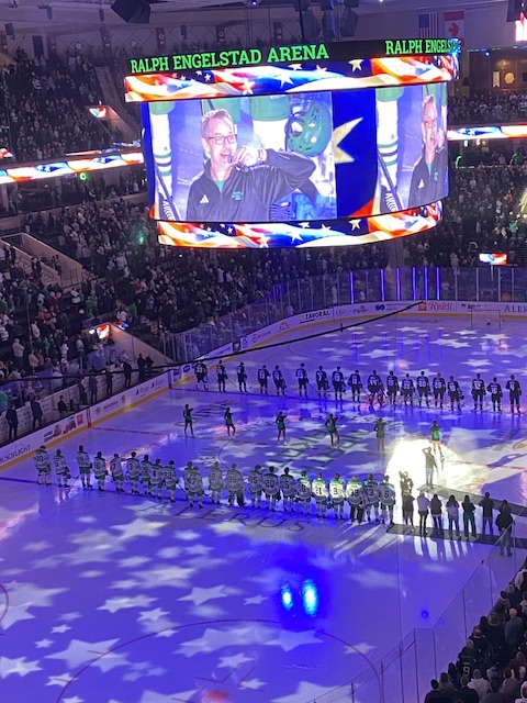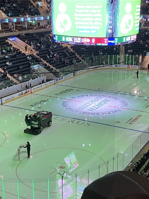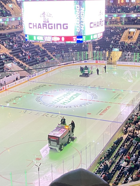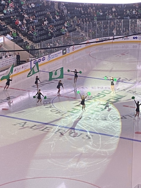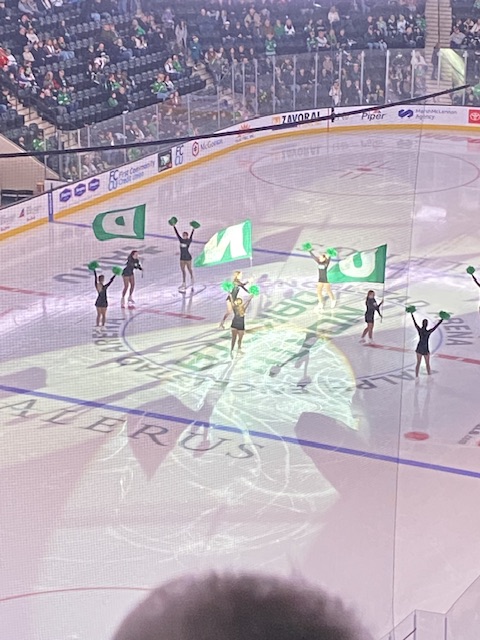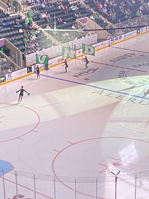 Innan matchens började fick vi se lagets cheerleaders komma ut på isen och de åkte i formationer och gjorde piruetter. Flaggorna med bokstäverna UND åktes också runt med. (förkortningen för universitetet) . Isen skulle ju också vara i allra bästa skick och innan matchen började och naturligtvis i pauserna mellan perioderna sköttes detta av Zambonin.
