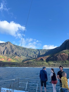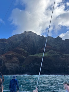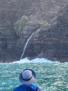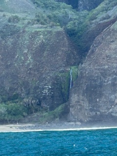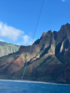… blev naturligtvis en kryssning på 4 timmar uppåt längs den branta, karga och mycket vackra Napali kusten. Napali kusten finns på den nordvästra sidan av ön Kauai men även i norra Still havet råder vinter. Även om det inte handlar om snö och is. Vintern här betyder ngt svalare, och ofta hårdare vindar än under under sommarhalvåret.