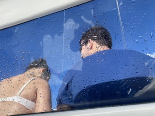 Det skvättade och stänkte rejält i fören på katamaranen och vi i familjen stod ut med det salta stänket nästan ända tills vi kom fram till punkten där det var dags att svänga och börja åka nerför kusten igen. Saltet stänkte så till den milda grad i ögonen, att jag hamnade att gå ner i den stora hytten/under taket och torka ur ögonen med medhavd handduk. Kort därefter kom Lillasyster och gjorde samma sak. Hennes ögon var alldeles röda och ett tag undrade vi om hon borde ta ut kontaktlinserna, men hon lät dem vara kvar och så småningom sved det mindre och blev bra av sig självt.