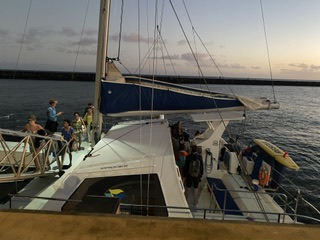 Vi åkte från hotellet till hamnen, Port Allen vid 13 tiden. Alla 35 passagerare ( katamaranen kana ta upp till 50 stycken.) skulle samlas kl.13.30. Båten skulle åka från piren kl.16.
