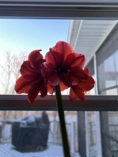 Jag var en aning besviken runt julen när knopparna på mina två amaryllisar bara blev större och större, men sprack inte ut lagom till högtiden. Igår när vi kom hem från vår resa möttes jag av dessa imponerande blommor ovan…. Och nedan. En besvikelse kanske över julen, men nu njuter jag verkligen av deras stora, vackra blomster medan kölden på -20 härjar där ute!