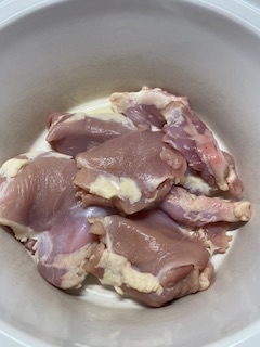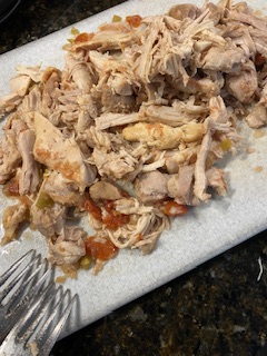Kycklingfiléerna (lår) sattes först i grytan. Sedan hackades en lök och två klyftor vitlök. Två burkar tomater, en liten burk med konserverade milda chili parpirkor och och salt, socker, chili, spiskummin och koriander blandades och hälldes över kycklingen. På med locket och låt koka i sex timmar på låg värme. Busenkelt.
