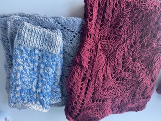 Sjalen till höger och vantarna och halsduken till vänster.