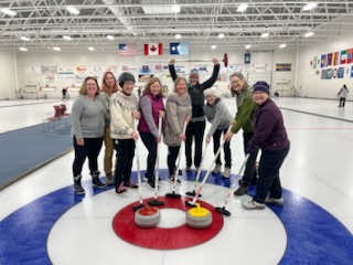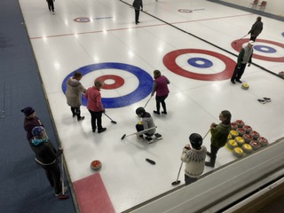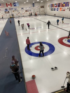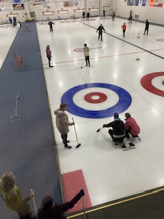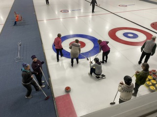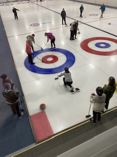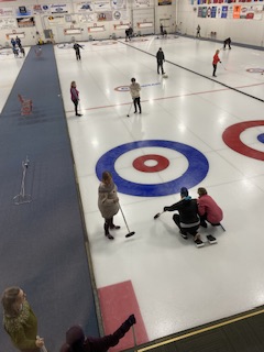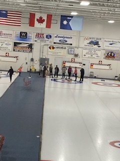 På fredagen blev det ngt så trevligt som curling för hela slanten! Vid 17.30 tiden infann vi oss i snöyran ( den började på fredagskvällen) och efter en enkel men riktigt god middag bestående av en hamburgare och fransk potatis som serverades vid Mesabi Curl ( hallen) den kvällen, så blev det då curling för sju av oss.