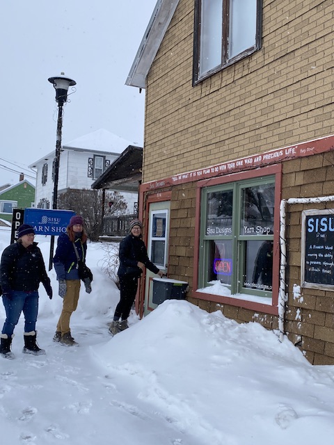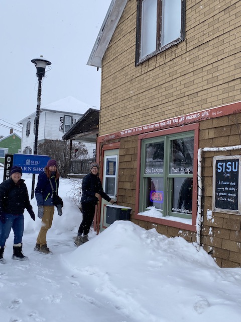 På lördagen begav fem av oss på utflykt i snöyran och vi åkte till det lilla samhället och turistorten Ely ( uttalas; Iili) till en pytteliten, ursöt liten garnbutik som lystrar till det fantastiska namnet Sisu Yarn Shop ( Sisudesigns.org)
