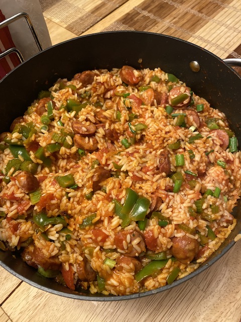 Eftersom jag hade mera ris kvar i kylskåpet efter Jambalayan för ett par dagar sedan, gjorde jag en till sats till middagen vår ikväll. Denna blev minst lika god som onsdagens. Jag använde lite väl mycket av Creole kryddan som består bla av salt och cayennepeppar, så maträtten hade minsann kick, som vi säger på engelska. Det vill säga, den var rätt starkt kryddad. Nu har jag lärt mig att älska starkt kryddad mat, så det gjorde inget. Och Lillasyster hade återigen egna planer, så hon åt ändå inte med Maken och mig.