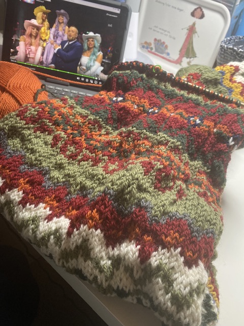 Jag jobbade på min jättehalsduk medan jag tittade och både stickningen och programmet fick mig onekligen på bättre humör.. Tack för det Mello.