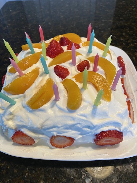 Denna mamma är ingen hejare på vackert dekorerade tårtor, men denna blev inte fy skam ändå. Det lite svåra med att göra bakverk hemifrån är att formarna i USA är för stora för recepten! Denna smet innehåller 3 dl vetemjöl, en ganska lagom mängd. Däremot är 1 dl endast en tredjedel av 1 amerikansk cup eller för att vara exakt 1 cup=240 ml. I ett lagom stort amerikanskt recept skall det oftast vara 2 cups mjöl, eller nästan 6,5 dl, vilket är mera än dubbelt så mycket som i dagens gräddtårta. Därför är det svårt att hitta lagom formar till mina mycket mindre ( i volym mätt) finländska recept.