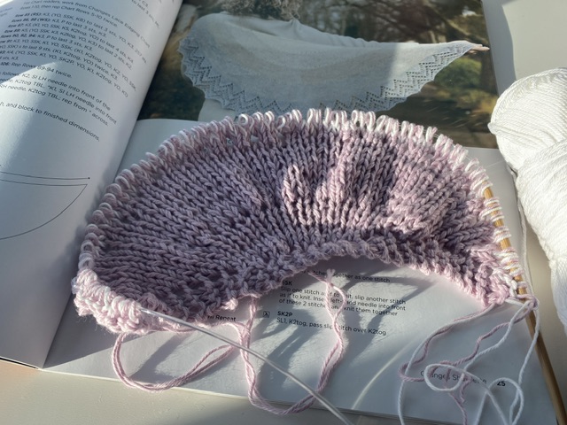 Ganska snabbt hade jag de första varven påbörjade och sedan gick det av bara farten. Länge sedan jag jobbat på en sjal och denna har en härlig spets kant att avsluta hela projektet med, så den ser jag fram emot.