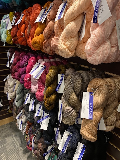 Jag hade andra ärenden till shoppingcentret inte så långt från oss denna soliga och nio plusgrader varma eftermiddag. Alltså förhöll det sig alldeles naturligt att jag gick upp en trappa till den lilla garn affären, eller hur…? Jag var på jakt efter Malabrigo Lace. Alltså Malabrigo spetsgarn, men hör och häpna, det fanns inte! Trots en hel vägg med olika sorters Malabrigo. ( som ses ovan)