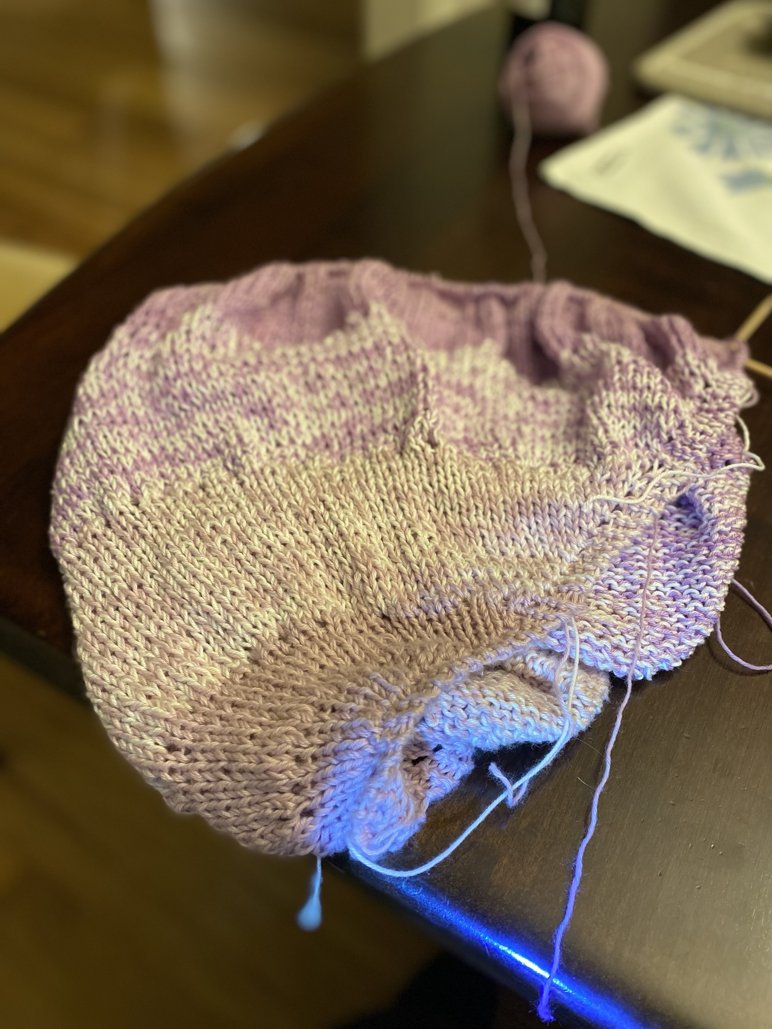 -Jobbat på spetsen på sjalen…. Läste mönstret fel och spetsen blir inte rätt… Funderade på att riva upp, men vågade inte med 257 maskor på stickan… Tänker att denna får bli övning och när garnet som jag beställde igår lördag kommer ( jo, det blev ju så att jag beställde rätt garn enligt mönstret till denna sjal.) så stickar jag en till. På riktigt så att säga.
