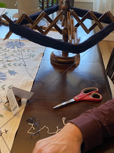 Maken jobbade hårt länge med min lilla handdrivna maskin för att få garn dockorna till snygga nystan och det tog minsann tid och tålamod. Det är ngt fel på maskinen och vi har inte riktigt listat ut vad ännu….Vissa nystan blir fantastiskt fina, men andra blir inte alls bra. Två utav tre gjorde Maken om!