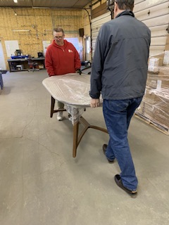 Maken får hjälp med bordet när det bärs ut till vår väntande trotjänare till bil. Nu ligger bordet i tryggt förvar bak i bilen väntan på hemkomst till Förorten