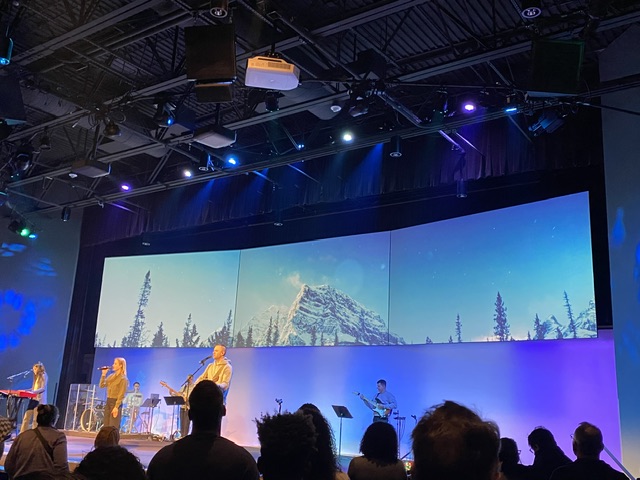 Innan vi styrde kosan norrut och hemåt strålade vi åter samman med Dottern och Svärsonen vid 10.30 tiden för att gå på gemensam gudstjänst i deras församling. Bilden ovan tog jag under den sista lovsången som vi sjöng. Salen var sgs fullsatt och prästens predikan baserade sig på Uppenbarelseboken. Inte ett helt lätt ämne, men även om Maken och jag inte hade hört de föregående veckornas predikningar med samma tema, gick det ändå alldeles utmärkt att hänga med.