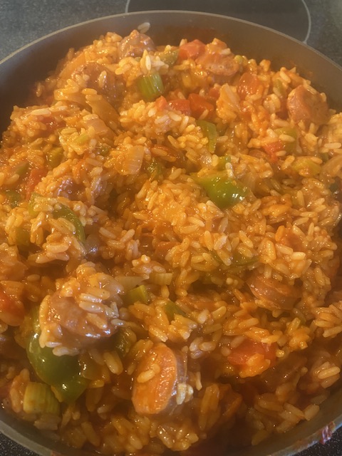 Jag hade med ingredienser och gjorde Louisianas svar på Pytt-i-panna ikväll, Jambalaya. Gott och enkelt och Maken och jag åt som om vi aldrig hade sett mat förut efter bilfärden.