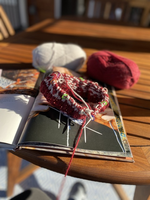 Ngn halvtimme blev det nog ute i blåsten, men sedan blev det alldeles för invecklat att hålla reda på mönster, stickor och garn i vindarna, så jag flyttade in till den inglasade delen av verandan istället och där blev det verkligen riktigt, riktigt skönt!