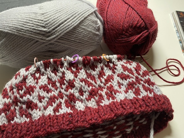 Under FaceTime samtal med hela familjen nu under kvällen, fick stickorna jobba ytterligare och jag kom en bra bit på väg på denna nya cowl/halsvärmare. Jag fick en nyck och kombinerade två mönster, vilket jag inte alls hade tänkt göra från början, men förhoppningsvis blir det bra ändå…. Hittills är jag i alla fall nöjd.