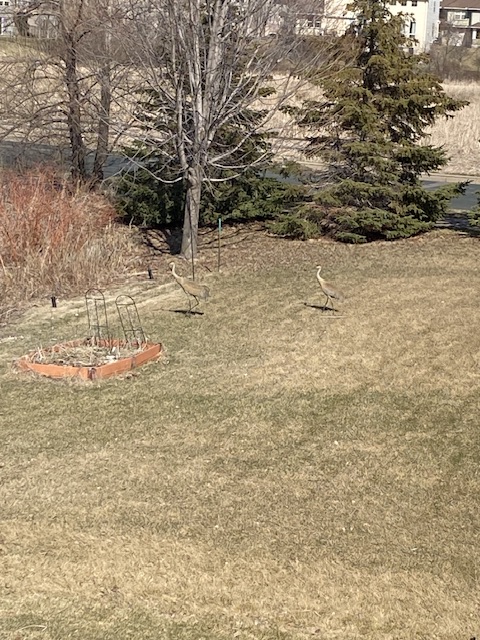 … är tillbaka! Tranorna har anlänt och åter hittat fågel brädan på vår bakgård. De är mycket ljusa i färgerna nu på våren för att smälta in med landskapet. Till sommaren och allt efter att träden får löv och gräset grönskar, mörkar även deras fjädrar för att kamouflera dem. Tranorna väsnas och är allt annat än tystna, men de är ju bara så härliga! Lilly hunden mår helt klart bättre redan och det onda ögat hindrade henne inte det minsta från att skälla högljutt med viftande svans när tranorna befann sig på vår gårdsplan just innan jag tog denna bild. ( Lilly skrämde alltså iväg dem på grannens gård.)