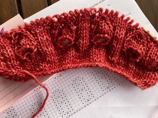 Innan dess beslöt jag mig för att använda det röda yllegarnet till tulpanerna som jag jobbat på de senaste dagarna. Måste säga att jag börjar lära mig hur man stickar sju maskor in i en maska nu och det börjar se en aning snyggare ut i alla fall.