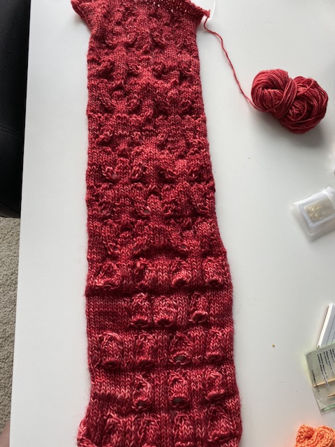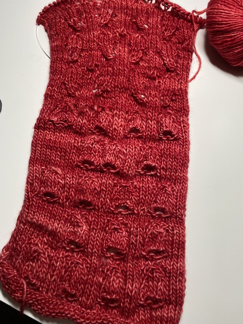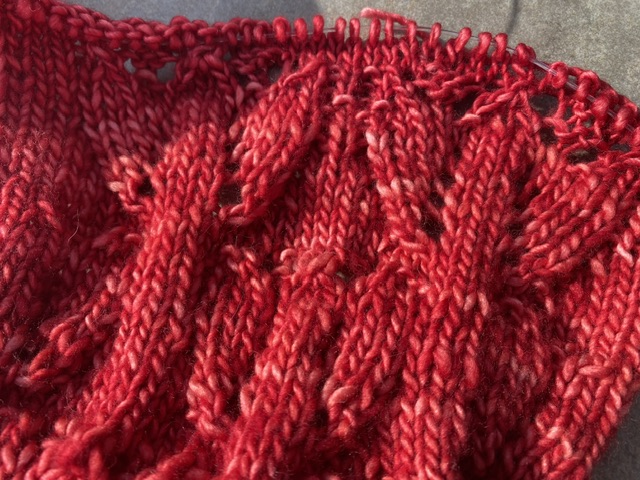 … på tulpanerna på halsduken börjar nu synas och allteftersom har mönstret och diagrammet blivit familjärt och mycket enklare att jobba med. Detta yllegarn skiftar i färgen och är ibland rödare och ibland mera rosarött och naturligtvis ser färger annorlunda ut också beroende på var jag fotograferat den.