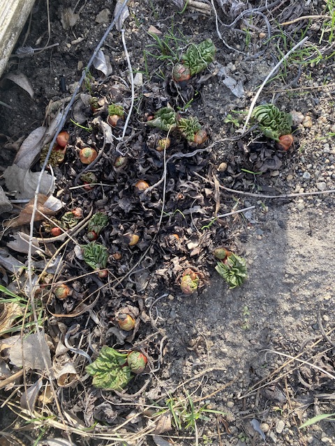 Lite senare gick jag ner till trädgårdslandet för att ta mig en titt på rabarbern igen och trots den rätt kyliga våren, händer det ett och annat med både rabarbern och gräslöken.