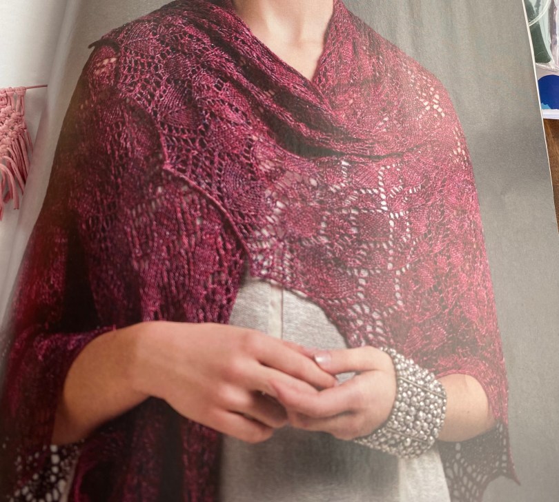 Själv kunde jag inte låta bli att ta mig an sjalmönstret som jag hittade häromdagen i en brittisk sticktidning. jag hade nämligen passande garn och stickor hemma….