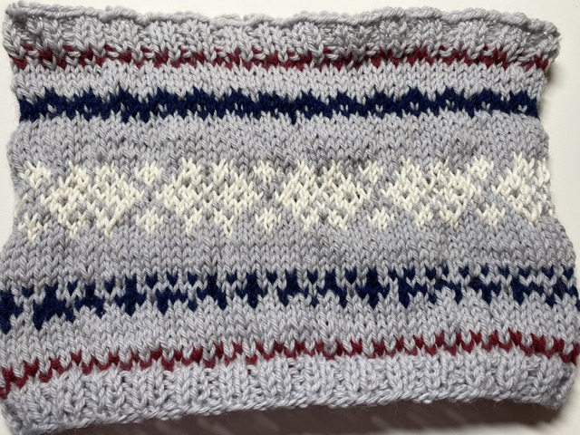 Medan jag åter besökte Vatikanen virtuellt på eftermiddagen och såg färdigt på Påvens begravning, stickade jag klart den lilla halsvärmaren som jag påbörjade i fredags. Detta mönster är egentligen en del av mönstret till ett ok på en tröja. Jag hade inte tillräckligt med garn för att ta mig an en hel tröja till följd av att jag använde restgarn i ylle. Detta garn var av märket Ella Rae. Om jag inte minns helt fel är garnet tillverkat i Türkiye.