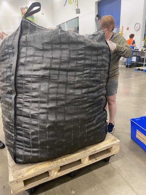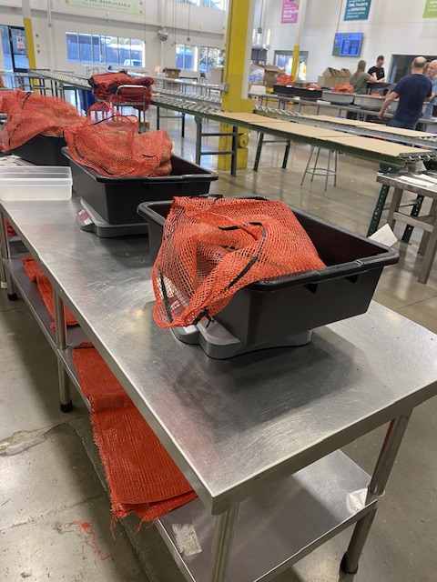 Vid denna stora distributionscentral har jag och min bibelstudie/diskussiongrupp från församlingen spenderat denna tisdagskväll. Till denna central anländer dagligen enorma säckar och lådor med olika livsmedel som av eller anledning inte kan säljas i de vanliga matbutikerna. Denna organisation förlitar sig på volontärer och andra frivilliga att hjälpa till med att packa om matvarorna i mindre förpackningar, så att de sedan kan vidareföras till speciella matbutiker runtom i delstaten som säljer mat förmånligare än normala matbutiker för mindre bemedlade.