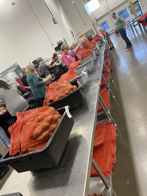 Vår grupp hade precis blivit klara med vår första enorma säck potatis och kände oss mycket duktiga… när nästa säck levererades med en handtruck av en av de anställda direkt! Bara att tag i arbetet igen. Däremot var det en mycket trevlig kväll med många händer som hjälptes åt och de två timmarna gick verkligen snabbt!