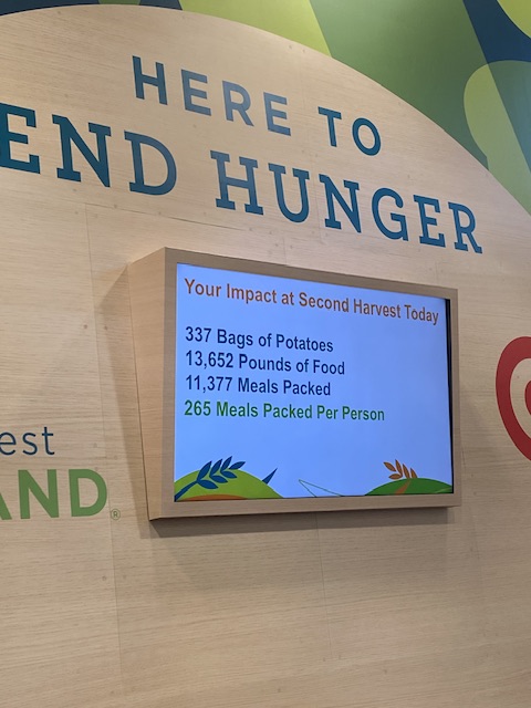 Vi avslutade skiftet med att städa upp efter oss enligt direktiv och fick sedan ta del av en sammanfattning över kvällens arbete: inte illa alls som ni ser på denna skärm. Vi packade totalt 337 säckar med potatis och de vägde runt 13 000 amerikanska pund, vilket i sin tur ligger på runt 6100 kg. Detta i sin tur räknades om till måltider och det blev 11 377 måltider eller 265 måltider packade per person som hjälpte till denna kväll.