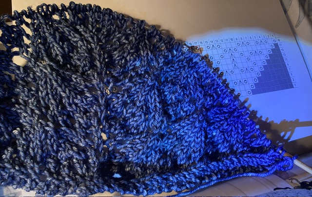 I morse, innan den dagliga träningen, lade jag upp maskorna för första gången till denna sjal och då såg det ut så här. Inte dumt alls och jag trodde nog att det var rätt….