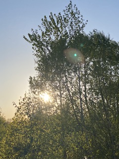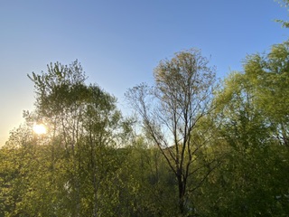 För att tala om ngt helt annat än dagens stickning, så var vädret underbart hela dagen. Stålande sol och svalare än under tisdagen. Runt +20 med svala nordanvindar. Så oerhört härligt och mycket mera vårlikt än den sommarvärme/hetta veckan började med! Bildernas ovan knäppte jag runt 19.30 tiden innan solen gick ner bakom grannhusen. Träden har formligen exploderat i skir vårgrönska de senate dagarna och man blir ju bara så glad…!