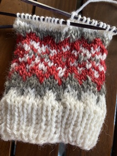Efter flera dagar med sjalar och mindre och mera lyckade försök med spets, tog jag en paus från de projekten. Grävde i korgen med restgarner och satte upp maskor för en socka. Det går bra att sticka yllesockor trots värme. Projektet är litet och hålls mellan händerna. Inget som draperar över en. Så här långt har jag kommit och är mycket nöjd med färgvalet och mönstret.