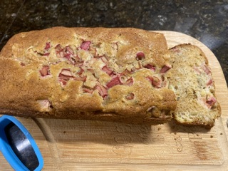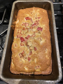 Den första rabarbern skördade jag på måndagen och nu var ju vädret alldeles perfekt för att stå i köket, så jag testade ett nytt recept: Rhubarb Quick bread. I Norden skulle dessa sk. Quick breads klassas som en kaka, typ sockerkaka, men här kallas de bröd.