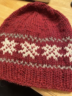 Efter den enkla middagen ikväll som bestod av Jambalaya, hade vi ett långt och trevligt FaceTime samtal med Sonen och jag stickade klart barnmössan som jag började med i förrgår. Den blev inte så bra som jag hade hoppats. Jag hade för många maskor per strumpsticka ( 20), samtidigt som jag hade för få maskor att flytta över alla maskor på en rundsticka. Då uppstod naturligtvis problemet att hålla alla maskorna på stickorna. Jag försökte sticka i bilen medan Maken körde till stugan i förmiddags, men det blev alldeles för svårt, så det var bara att sätta bort projektet så att inte flera maskor skulle tappas. Jag fick det hela fixat, men det blev att sy inuti mössan på några ställen.
