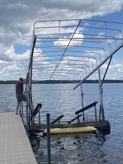 Maken tog direkt tag i projektet han inte fick gjort för några veckor sedan och flyttade ställningen för båten till sin rätta plats för sommaren. Med tre uppblåsbara kuddar under ställningen stod han själv på bryggan med ett rep i handen och guidade den stora ställningen till sin plats.